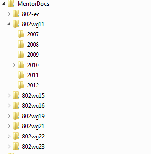 The first time you start the application, you will be asked where you would like to save the files downloaded from the Mentor server. Your selection will be recorded in a configuration file at <home>/.dociimentor/dociiconfig.xml, where <home> is your home directory. By default, files will be organized in separate folders for each working group and for each year within your selected folder, as illustrated below: